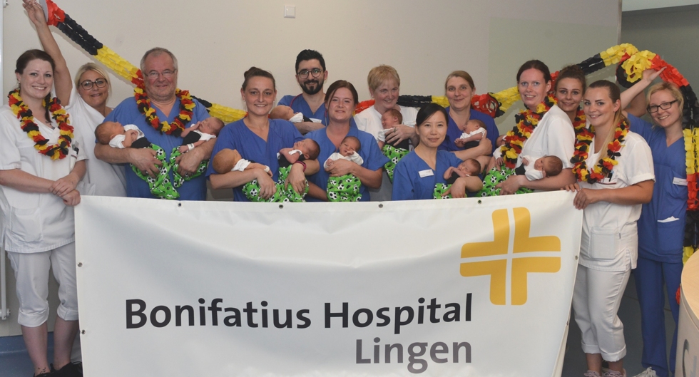 Das Team der Geburtshilfe des Bonifatius Hospitals Lingen hat sich mit elf Nachwuchskickern im Alter von 1-5 Tagen fürs Gruppenfoto aufgestellt. Jährlich kommen in der größten Geburtsklinik des Emslands über 1200 Neugeborene zur Welt. In den 32 Tagen der WM werden also über 100 Babys im Boni das Licht der Welt erblicken. Spannende Zeiten für werdende Eltern und Fußballfans!