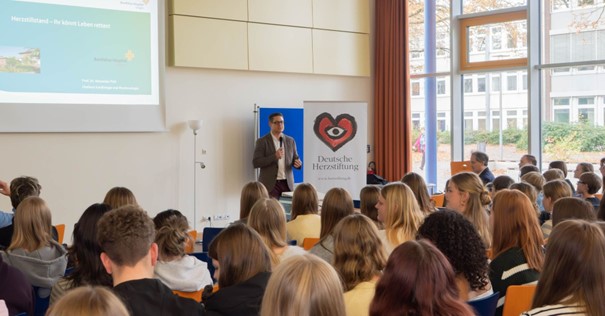 Abschließend bedankte sich Herr Sieberg für die großartige fachliche Grundlage, die durch diesen Vortrag von Prof. Pott für den Herzensretter-Kurs geschaffen wurde. „Den Schülerinnen und Schülern wird es nun leichter fallen, die Vorgänge rund um das Thema Wiederbelebung nachzuvollziehen und die außerordentliche Bedeutung von Wiederbelebungsmaßnahmen zu erfassen. Auf dieser Basis kann nun in der nächsten Woche ganz praktisch mit dem Erlernen der Wiederbelebung begonnen werden.“ verdeutlichte Sieberg den Stellenwert der Einführungsveranstaltung.